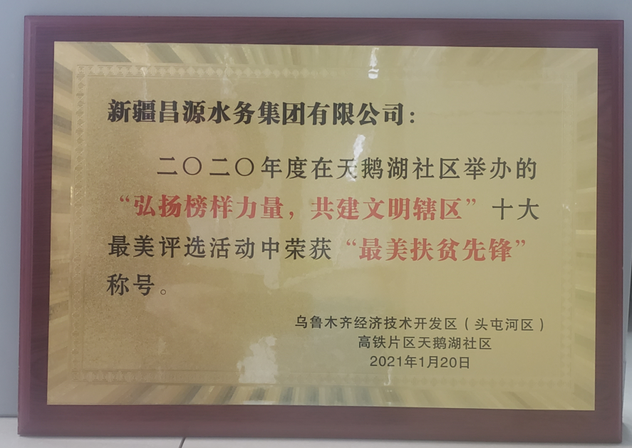 2021年1月20日,集團(tuán)公司在天鵝湖社區(qū)舉辦的“弘揚(yáng)榜樣力量,共建文明轄區(qū)”十大最美評(píng)選活動(dòng)中榮獲“最美扶貧先鋒”榮譽(yù)稱號(hào)。