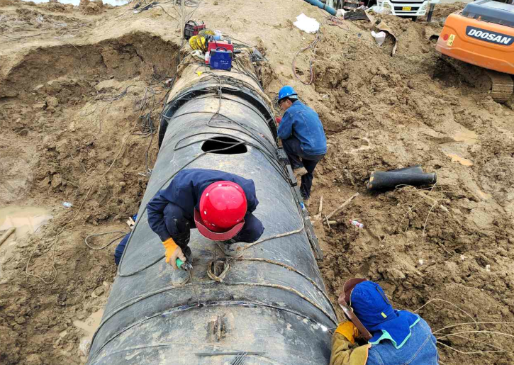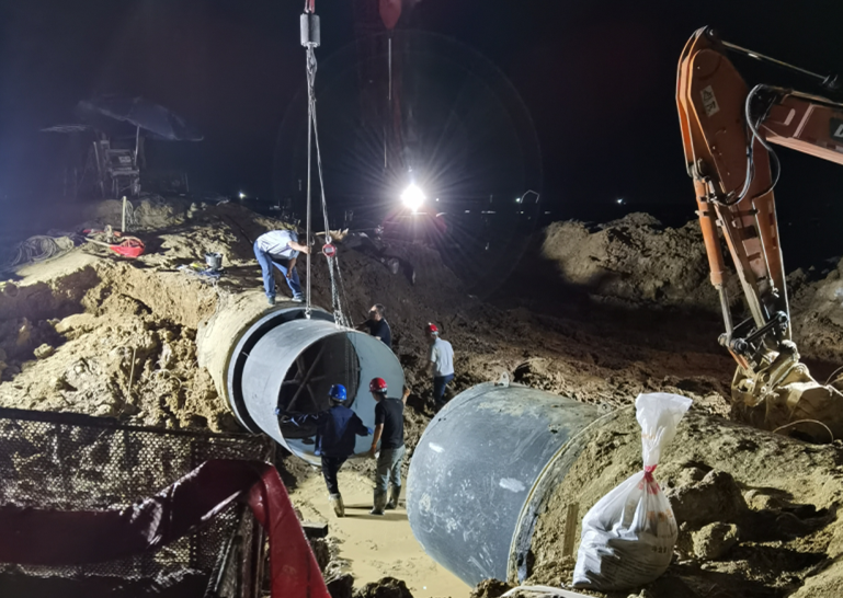 在摸清管道基本情況后,為快速恢復(fù)供水,準(zhǔn)東供水公司組織精強(qiáng)力量、協(xié)調(diào)搶修設(shè)備,搶修人員頂烈日戰(zhàn)黑夜加緊搶修,采用“車輪戰(zhàn)”方式接力作業(yè)。搶修隊(duì)員們的手臂、臉頰、前胸、后背滿是汗水,流淌而下的汗水浸濕了衣衫、蟄疼了眼睛。經(jīng)過5天5夜的連續(xù)奮戰(zhàn),在大家的共同努力下于8月14日恢復(fù)正常供水。為確保后續(xù)供水安全,準(zhǔn)東供水公司又組織檢修隊(duì)員對沿線井室管道進(jìn)行檢查。